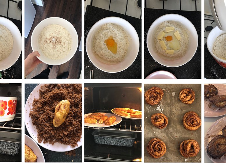 Roll out each ball of dough to a strand of 30 cm long. Mix the brown sugar and the cinnamon well together in a baking dish. Moisten the strand of dough with water, then roll it through the sugar mix. Remove the strand and roll it up into a tightly coiled round.